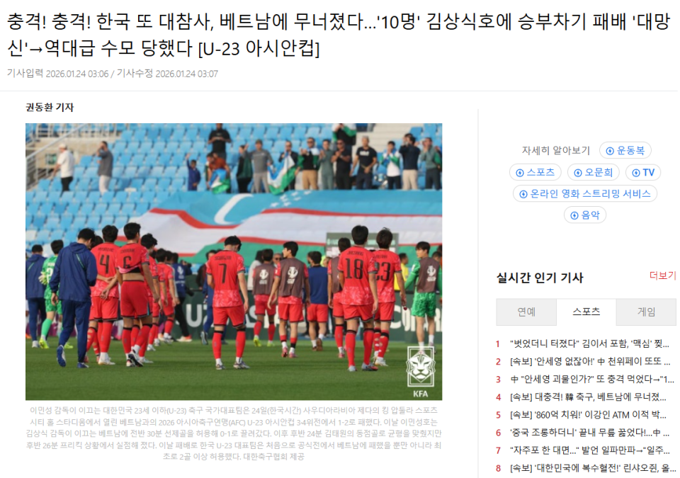 首尔体育网站同样用“巨大灾难”形容韩国队的表现,“韩国U23在对阵越南时6胜3平保持不败,但这一次却输给了对手,品尝到了失利的滋味。”