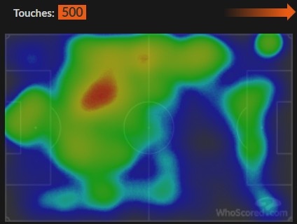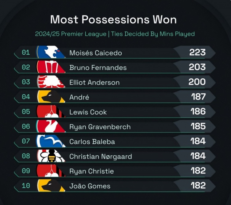 布鲁诺本赛季完成赢回球权数据第二多,这是一次他在梅努助力下完成射门的实验